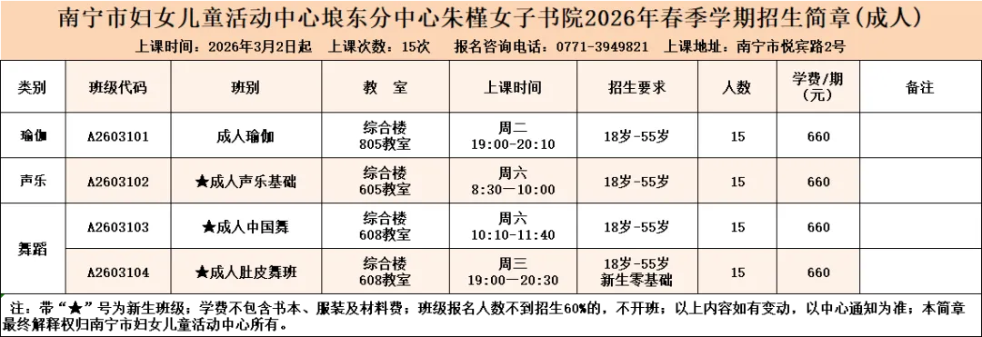 课程如有变动,中心将在微信公众号进行公告,或由中心工作人员进行通知,敬请留意。因学员自身原因造成的缺课,中心概不补课或退费。因不可抗力原因造成的集体停课,该课程顺延。