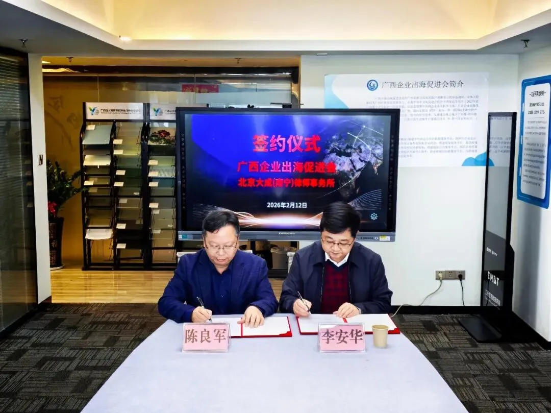 2026年2月12日,北京大成(南宁)律师事务所与广西企业出海促进会正式签署合作协议,双方建立合作关系,致力于为广西企业“走出去”提供法律保障与服务支持,推动区域对外经贸与投资合作升级。