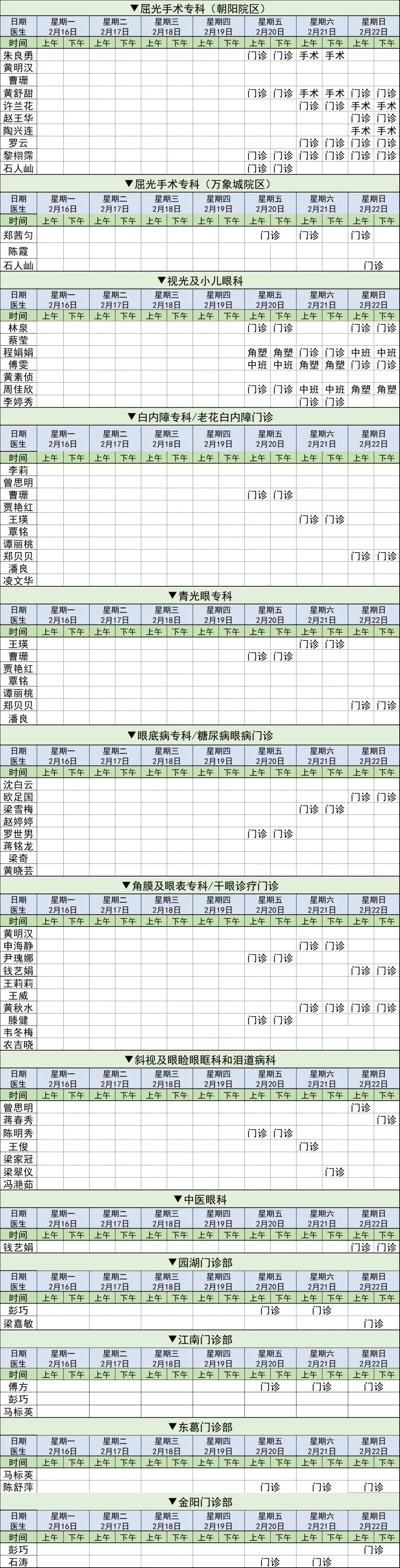 2、具体科室出诊医生排班详看下表、关注医院微信公众号“南宁爱尔眼科医院”或致电了解,眼健康咨询热线:0771-3131031。