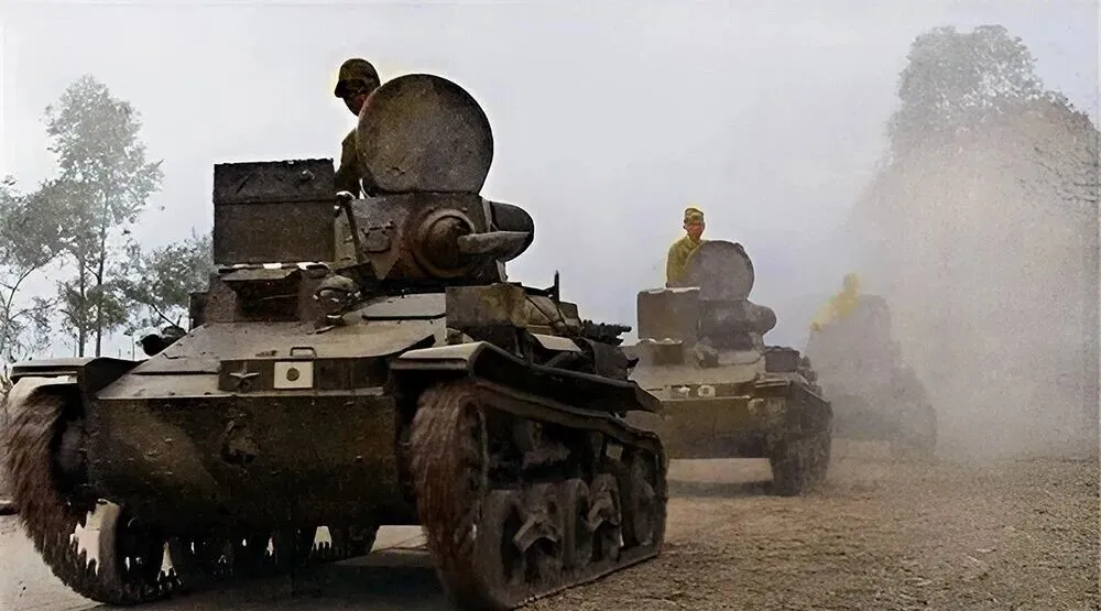这个家伙是装甲车队,履带碾在碎石土路上,尘浪一层接一层往后卷,炮塔像铁葫芦扣着,车前附着扫雷齿轮,吱呀乱响,那时候公路稀罕,车轮一过就是压痕,现在高架一串接一串,想想那会儿守军还在用骡马拉炮,差距可真大。