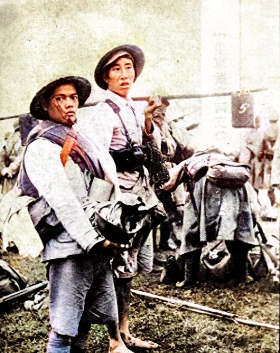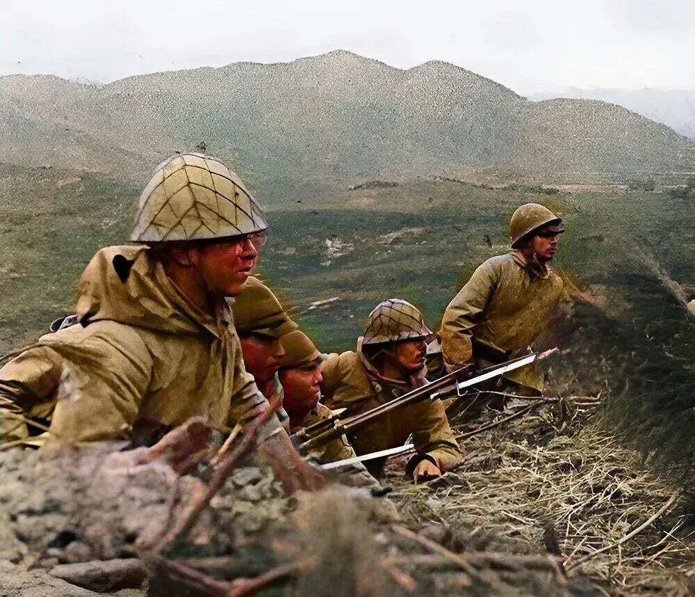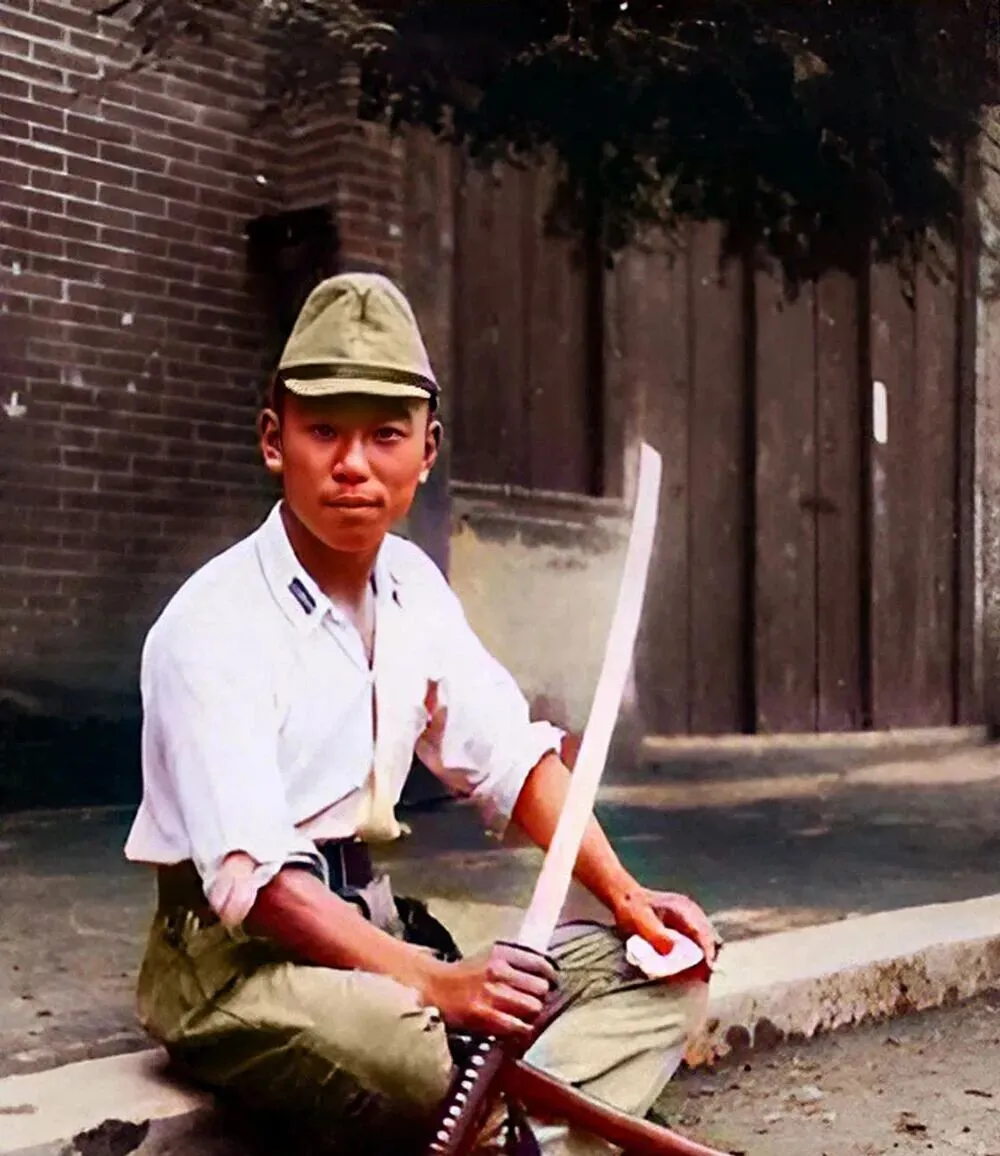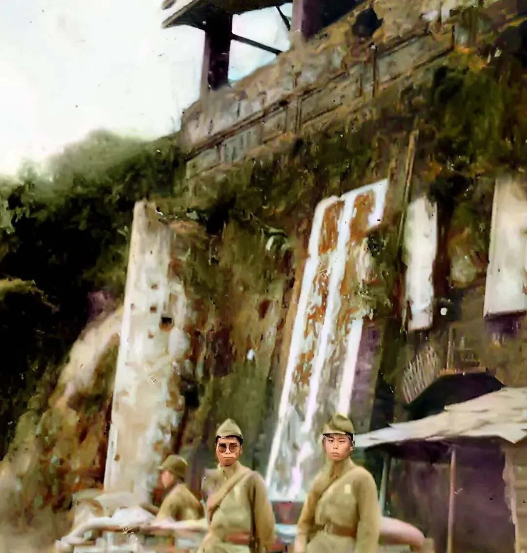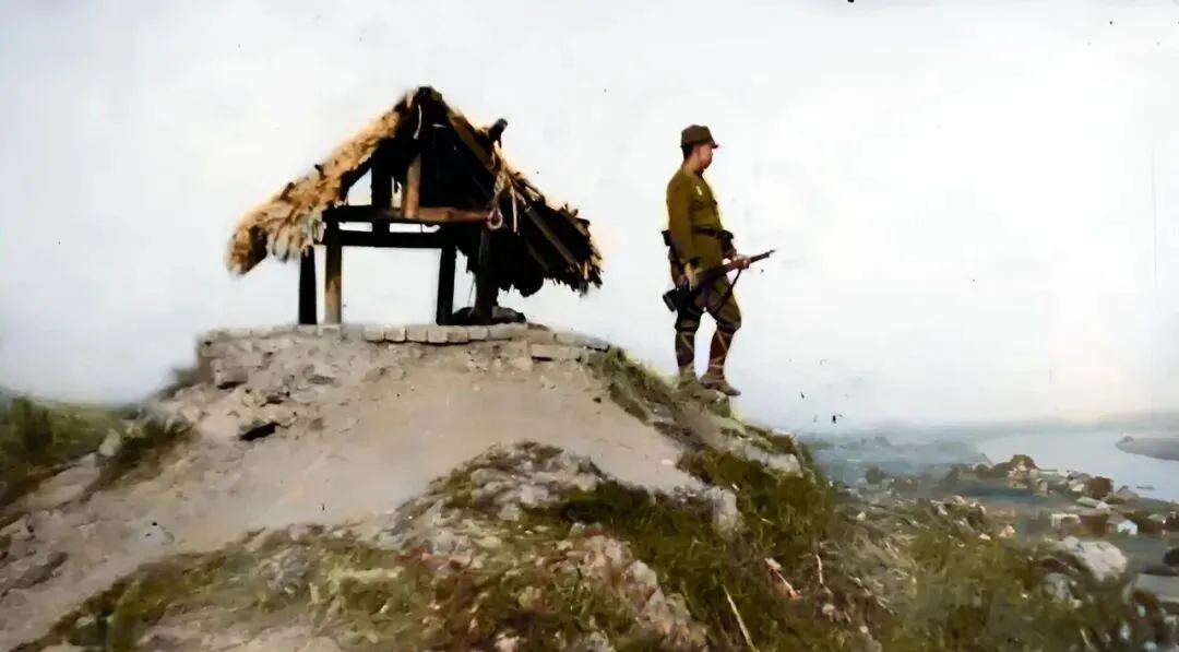 图中这处简陋小亭叫岗亭,茅草顶子破成了三角,木柱歪着撑住,日军把步枪别在臂弯上,眺着邕江水面,风一吹,草顶子呼啦作响,我外公说那时村里人划小船过江,远远看见这种身影就绕路走,现在江边是亲子乐园和跑步道,当年的刀枪气息,只能从照片里闻到了。