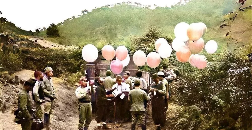 这个场景叫空投传单的气球,底下吊着纸包也有糖食,他们以为能骗到谁呢,山沟里的风一大,几只气球就被吹得东倒西歪,孩子见了会追,家里大人会一把拽回来,撕个粉碎。