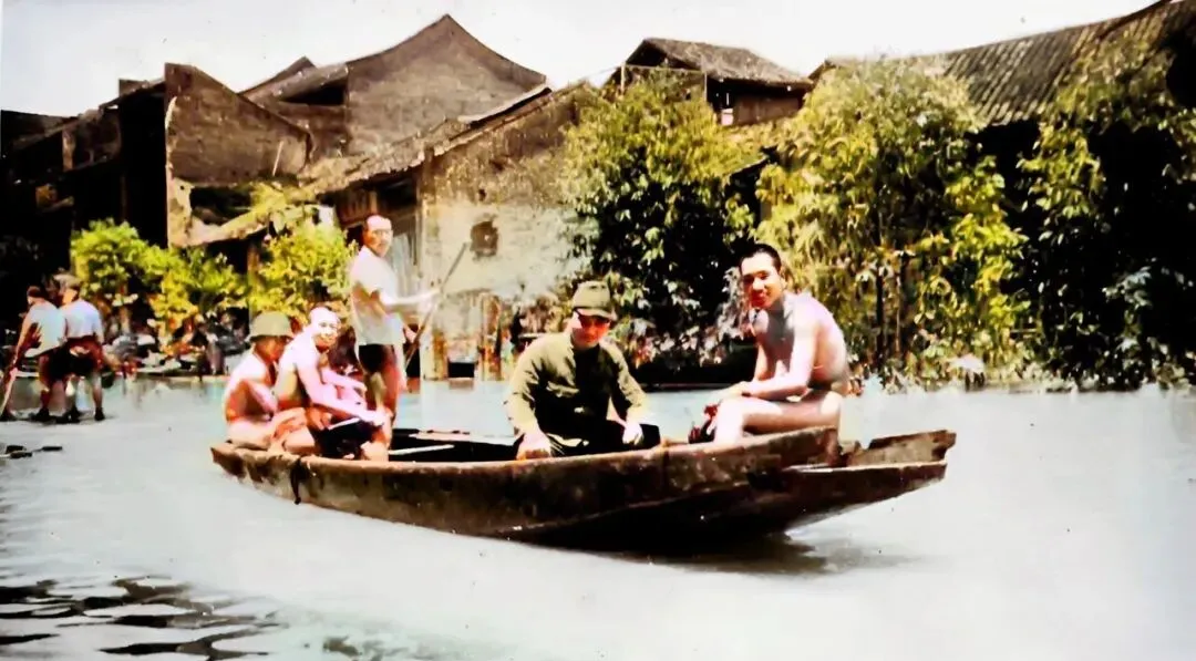 这张是城里发大水,街巷都成了沟,几个人坐着老百姓的小木船悠着走,有人打趣,有人戒备,背景里是瓦顶连着瓦顶,小时候见过这种窄船,木板边抚起来手有刺,现在南宁修了堤和闸,汛期消息一到手机就弹出来,时代真不一样了。
