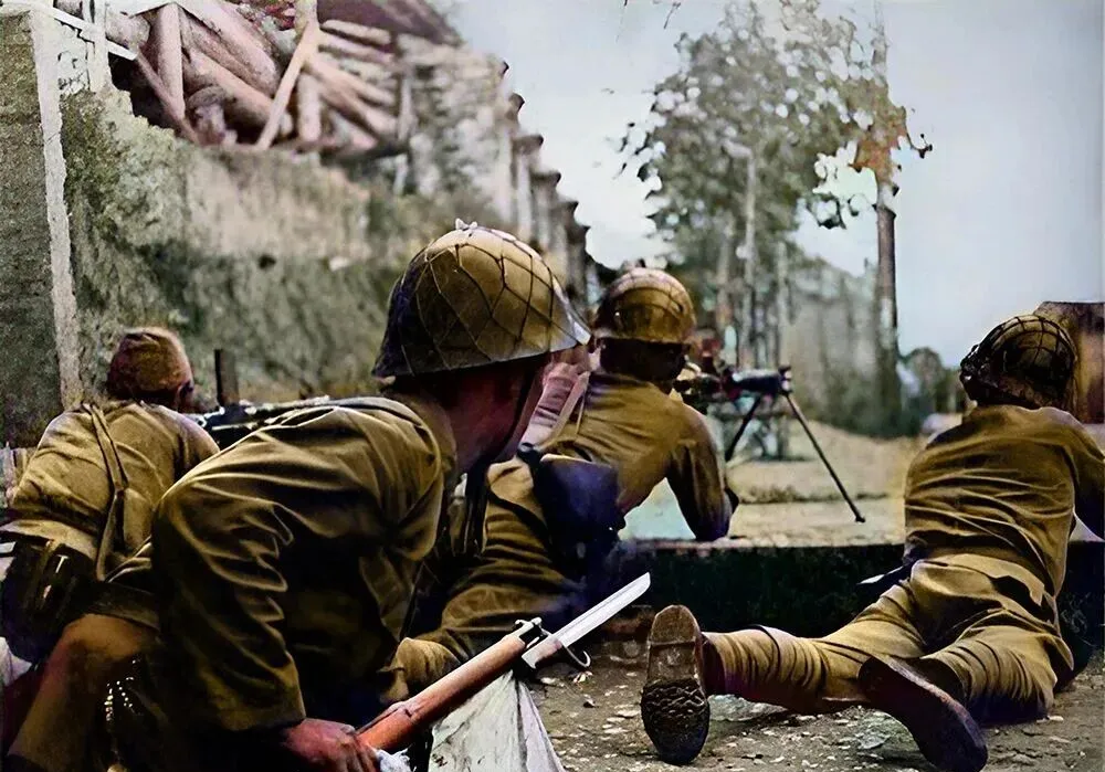 图中这排火力点叫机枪阵地,沙包、木板、门洞,随手就能成工事,几个兵猫着腰,扳机扣得紧紧的,街角空得出奇,连麻雀都绕路飞,奶奶说以前这里吆喝声不断,现在照片里只剩冷清。