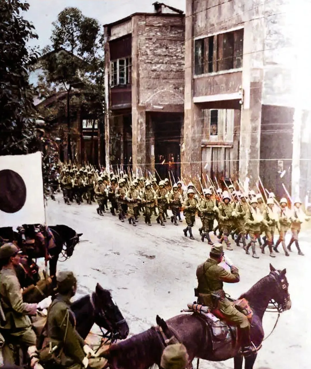 这张是入城仪式,长街窄而深,刺刀亮得晃眼,马队在前吹号,人群不敢出头,窗缝里露一两只眼睛,踢踏声和口令声撞在墙上来回弹,那阵仗摆给谁看,摆给被占的城看。