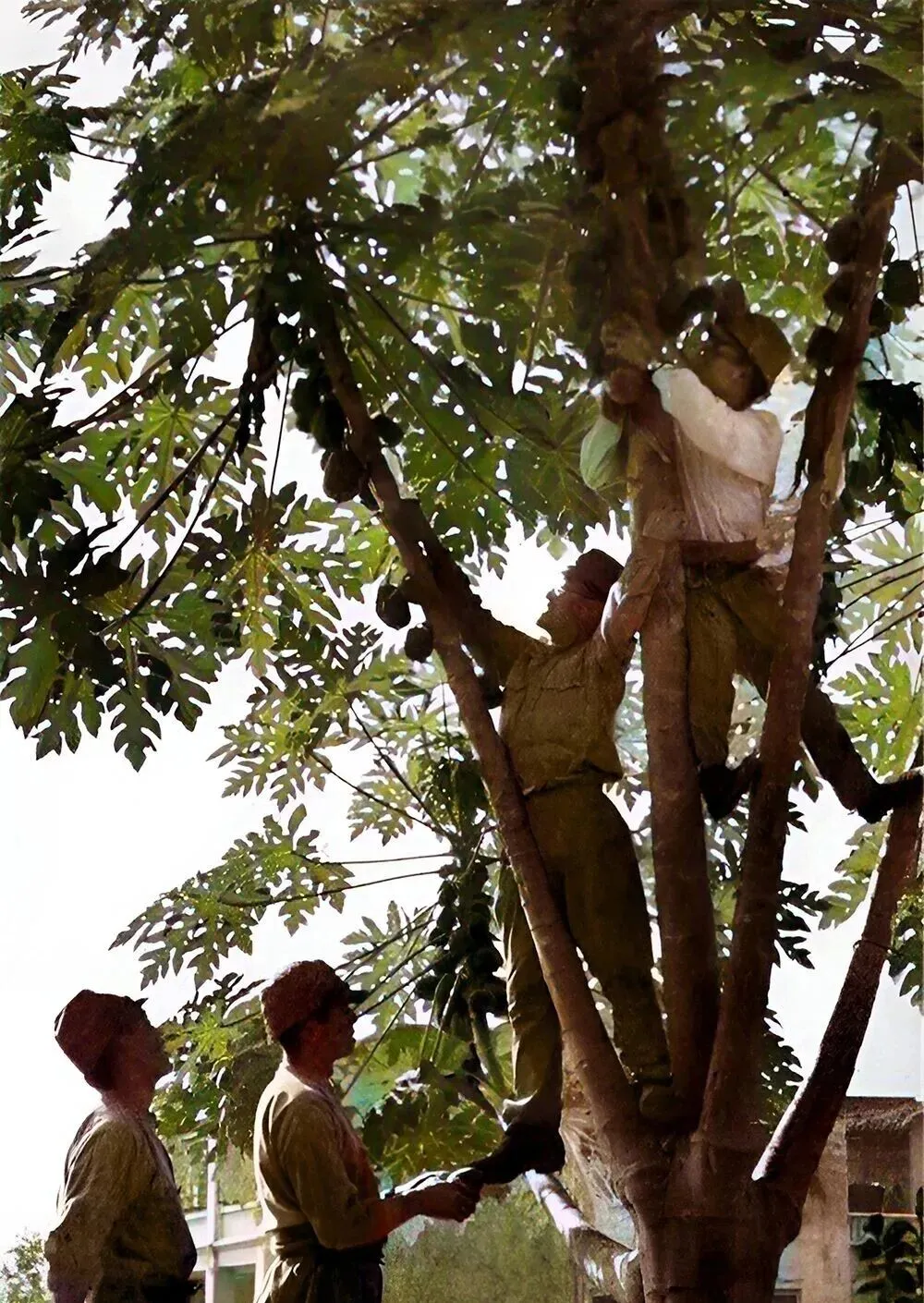 这几个人爬上木瓜树,树干粗得要两手抱,叶子掌般大,底下有人托着脚面,枝头的人伸手去拽果子,真把占领当自家后院了,老百姓的树老百姓的果,哪一颗不是汗水浇出来的。