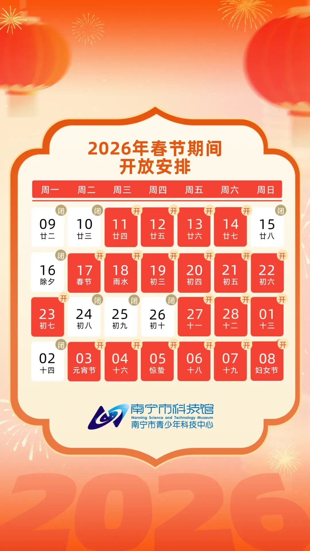 根据《国务院办公厅关于2026年部分节假日安排的通知》的安排,结合我馆实际,2026年春节期间开放时间安排如下: