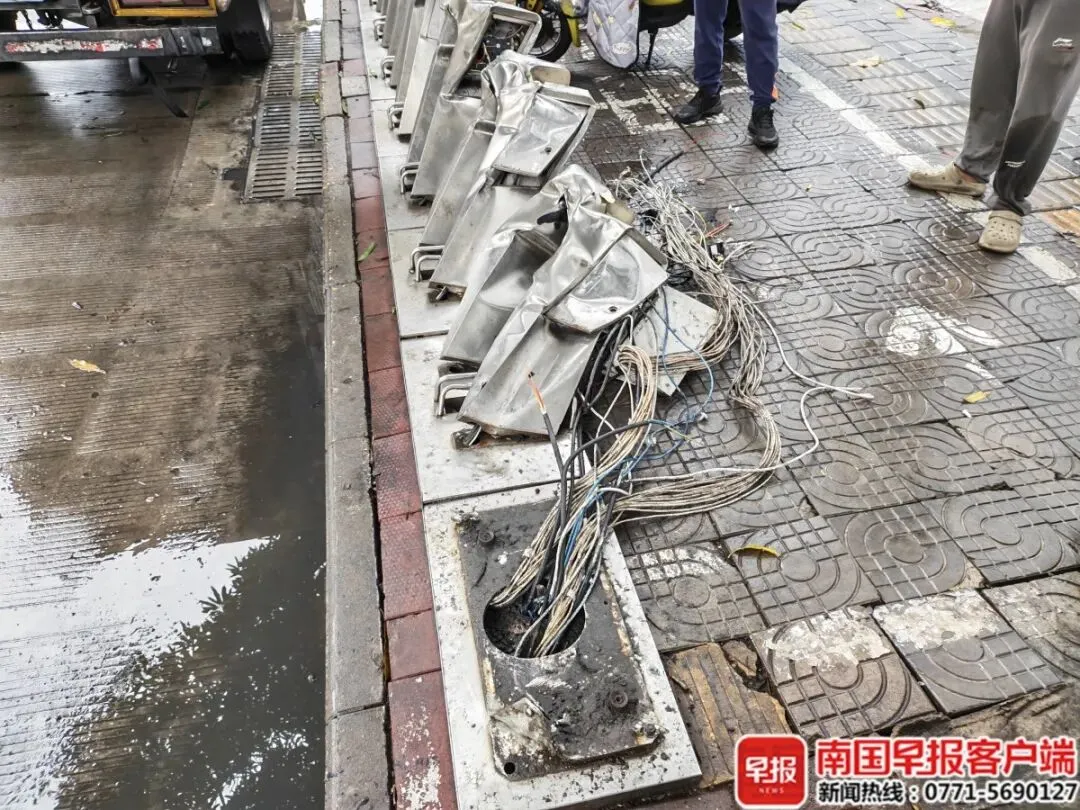 当天中午,南国早报全媒体记者赶到现场,肇事车辆已被拉走了,多个公共自行车车桩被压扁了,裸露出电线。一辆货车前来拉走已受损的几辆公共自行车及标识牌。