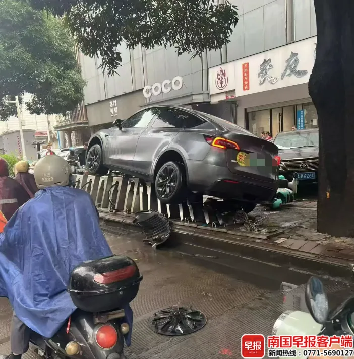10月30日,南宁市衡阳路发生惊险一幕:一辆特斯拉新能源小车不知何故突然失控冲上人行道,骑在了公共自行车桩上。
