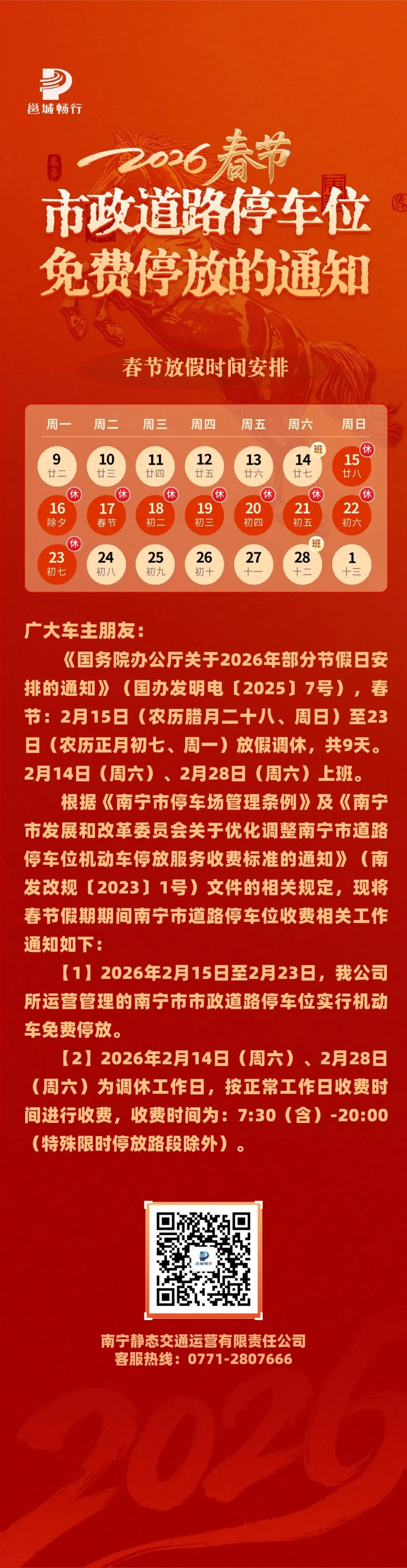 为缓解游客在北海老街景区的停车难问题,经研究决定,2026年2月15日08:00-2月23日22:30期间免费开放老街景区附近部分停车场及部分路段。现公告如下。