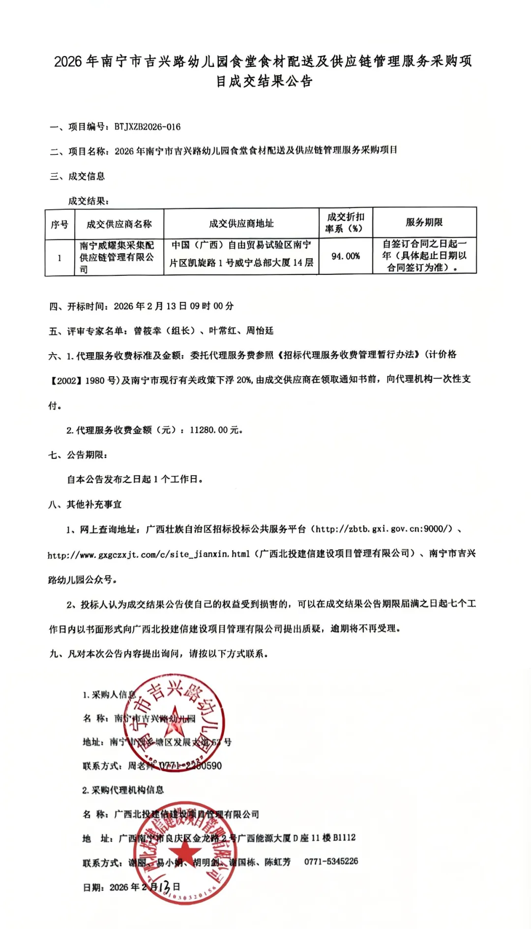 2026年南宁市吉兴路幼儿园食堂食材配送及供应链管理服务采购项目成交结果公告