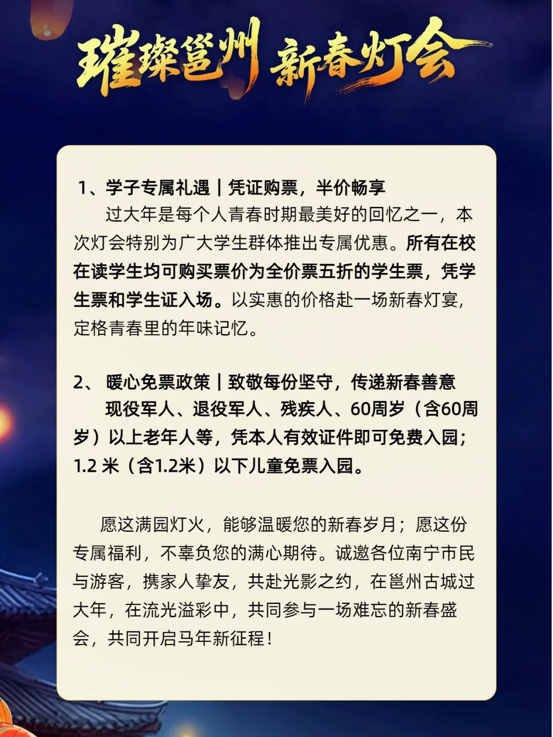 注:新春灯会门票不参与“一票3日使用制”及景区其他首道门票优惠活动。