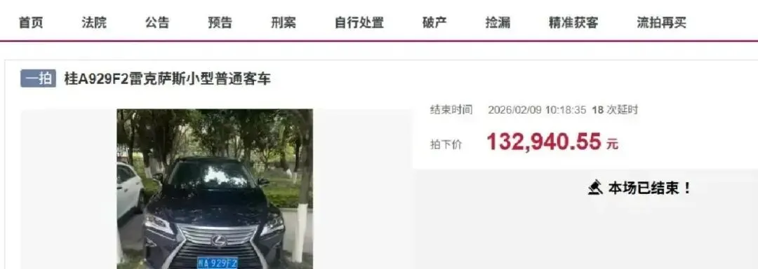 事情是这样的:2月9号,阿里拍卖上,一辆桂A929F2雷克萨斯RX200T被桂林法院挂出来拍卖。车是2016年7月出厂的,九岁高龄,跑了九万多公里,电瓶还亏电点不着火。起拍价8.994万,没降价,结果呢?14个人报名,最后9个真敢砍价,31次加价,硬生生拍到13.294万!成交价比起拍高了4.3万。