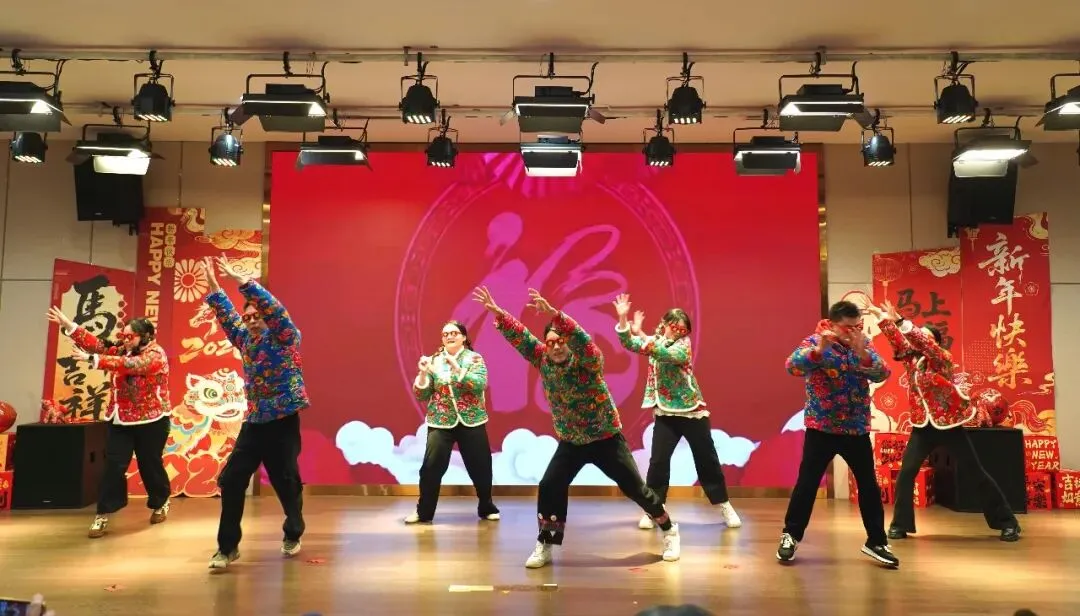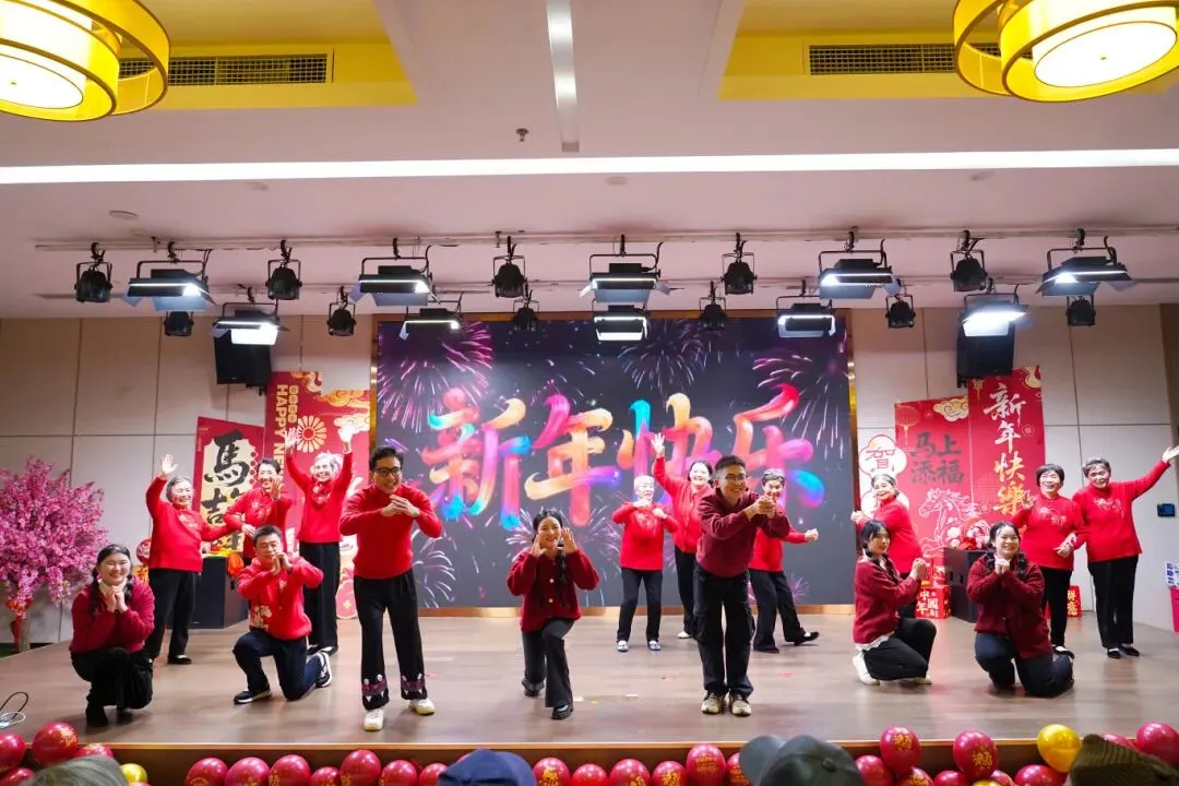 晚会最令人动容的节目,是由康养社区长者与工作人员联袂演绎的舞蹈串烧《马年大开怀》。参与表演的长者平均年龄85岁,她们享受生活,热爱生活,不经意流露出的眼角笑意,与员工们日常的陪伴有着千丝万缕的联系,深深感染了在场每一位观众。