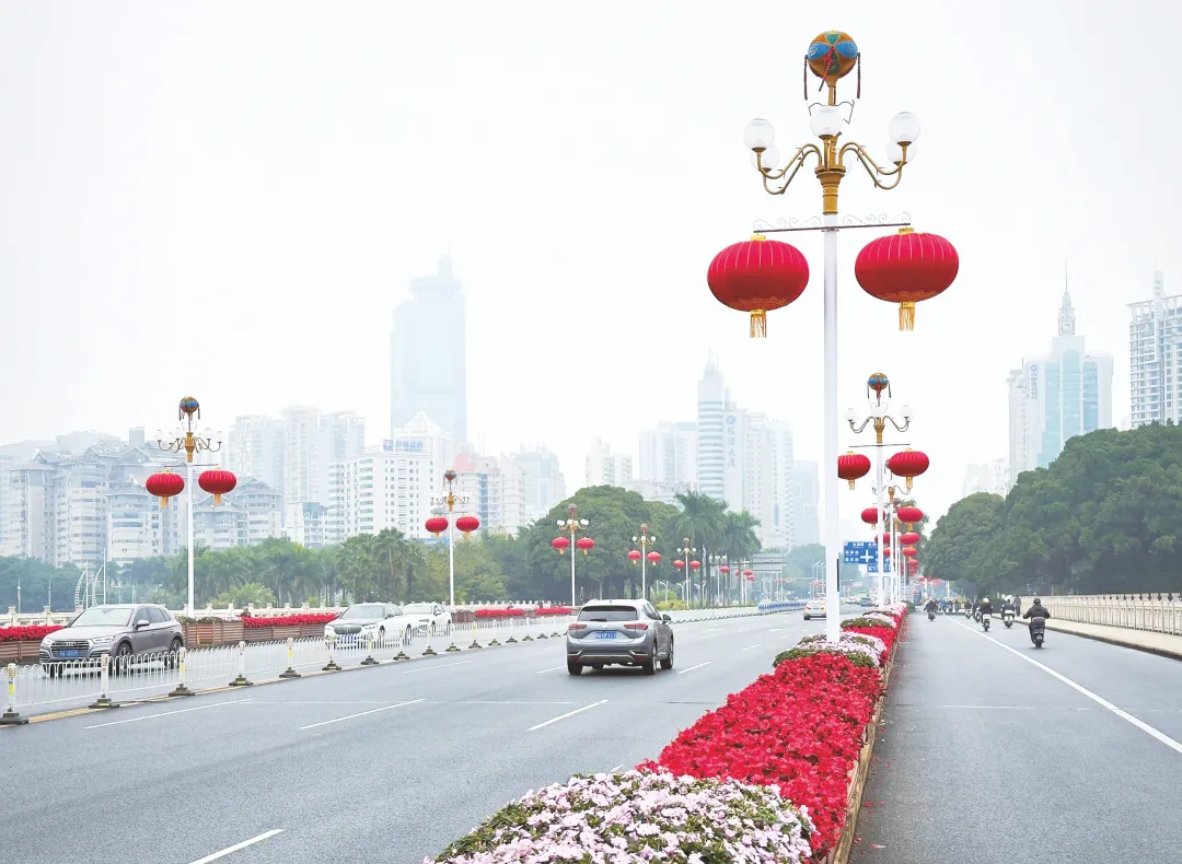 红灯笼、中国结、花卉小品……春节临近,绿城南宁满城“中国红”,承载着城市的温度,更寄托着人们对新一年红红火火、顺遂安康的美好祝愿。民族大道沿线灯杆上挂起大红灯笼,营造浓厚的节日氛围。记者 潘浩 摄