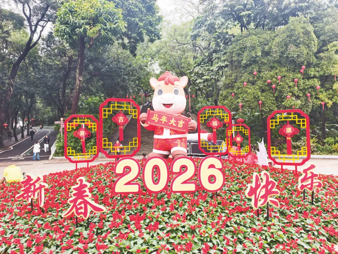 南宁市市政园林部门在主要道路悬挂灯笼1462组、中国结473组,在南宁人民会堂广场、民族广场电子屏前绿地等4处主要道路节点精心布置花卉小品。各市管公园也结合园景,设置各具特色的花卉造型,以红色系花卉为主,搭配“福”字、灯笼、生肖马等新春元素,营造浓浓年味。南湖公园在3个主要出入口及园内共布置了9处春节主题景观,让市民在漫步赏景中沉浸式感受年俗韵味。其中,在名树博览园入口,一组以壮锦马、红灯笼、祝福标语与时令花卉组合而成的景观尤为亮眼,其将生肖马年的文化符号与壮锦巧妙融合,既传递传统年味,又彰显浓郁的民族风情,吸引众多市民游客前来打卡。南宁市人民公园设置特色花卉小品,搭配新春元素,营造浓浓年味。记者 宋延康 摄