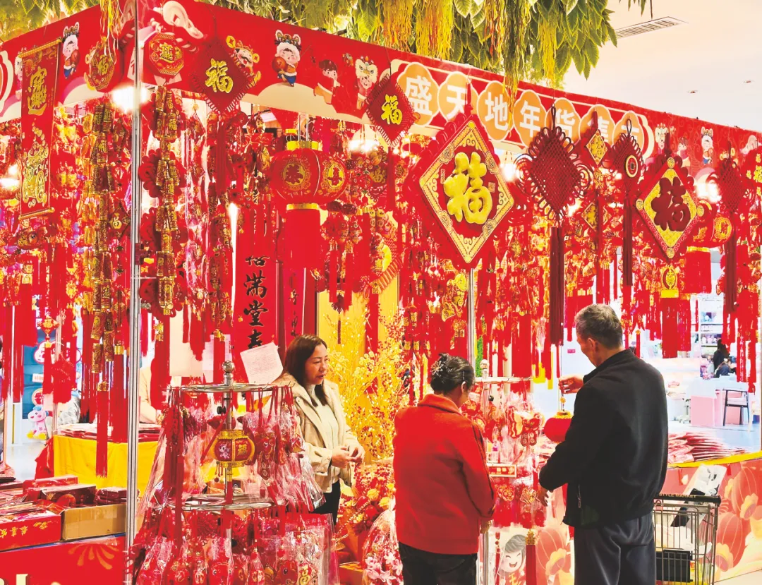商场、街区纷纷换上“红装”,琳琅满目的年货、丰富多彩的促销活动,让市民在选购中沉浸式感受新春欢乐氛围。“每年春节前都要来超市备齐年货,为家营造新春氛围。”市民李女士说。市民挑选年货饰品。记者 潘浩 摄