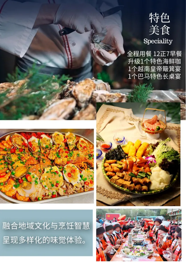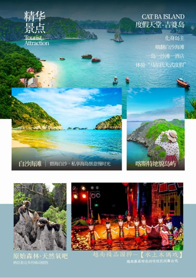 早餐后,乘渡轮前往海防,再乘车前往下龙,一路车览打卡自然奇观【升龙湾】,沿着这条最美的公路前行,一路蜿蜒,风景优美,沿途金色的沙滩、湛蓝的海水,以及翠绿的树木让人眼前一亮,一扫视觉疲劳,夹杂着海洋气息的清新不时地拂面而来,身临其境感悟自然独特的喀斯特地貌,感受“海中有山,山下是海”的风景画卷,欣赏拜子龙湾生态旅游区的原野之美和天造的迷人景观,在热带湿润气候的作用下,近距离抚触喀斯特地貌形成的未经雕琢的一座座独特地貌岩石,大气磅礴的让人迷恋,拜子龙 湾不仅拥有的数百座露水岛礁和长达数百公里柔软细腻白沙滩的海岸线,这里的水质是最好的,与山头的植被浑然一体,可以用“未经触摸”来形容,往远处看四面八方都被连绵不绝的群山包围,与大陆隔绝开来,大岩块被谜一样地切割成五颜六色、鳞次栉比的分层。逆光下显现出来的远山轮廓,加强了神秘感,周围岩层的方向不是平行于地面,而是霸气地指向天空,伴随着因回岸而更加汹涌的海浪,给人一种桀骜不驯的感觉!
