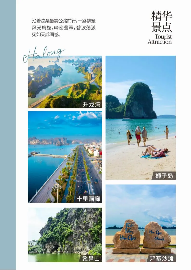 车览越南版【十里画廊】,从下龙沿海公里直下,这一路风景优美,蓝天白云笼罩下宛若名 师的一幅画卷。沿途群峰竞秀,百岩争奇,波光凌凌的海水点缀其间,返朴归真,再现了远古文明之典型。丰富的自然景观,人行其间如在画中。远处望去,则是奇峰异石。在期间穿行,就像走入一副自然 的山水画卷。