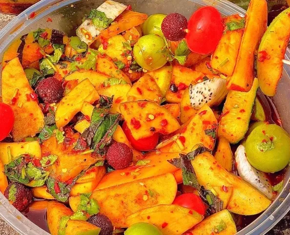 这里的口味偏酸辣,不是那种直愣愣的辣,是带着果香的酸。推荐尝尝当地的“酸嘢”。这可不是简单的水果拼盘,而是把芒果、李子、木瓜切块,拌上辣椒粉、盐和糖醋。咬一口,酸甜辣咸在嘴里“打架”,脆生生的,唾液腺瞬间投降。那种滋味,像极了这里的天气,热烈又干脆。