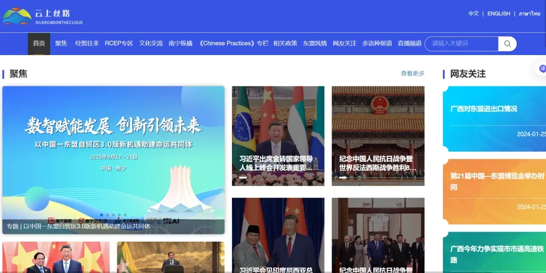 在第 22 届中国—东盟博览会期间,推出《WOW!当AI遇上东博会》等主题策划,生动展现中国与东盟国家的经贸往来成果及发展新貌,总浏览量超241.7万。全程联动中央级媒体,推出短视频《印尼小姐姐的南宁超“A”生活An Indonesian Girl's Life Filled with AI Technology in Nanning》获新华网客户端、人民网及人民网海外社交平台(“看见中国”脸书“人民之声”X)转发,浏览量93万+;与新华社新华网联合制作推出融媒体产品《寻迹中国 | 外国博主逛东博会 被中国好物“强势种草”》在新华网首页重点位置和新华网客户端、新华社客户端推出,浏览量超100万人次。