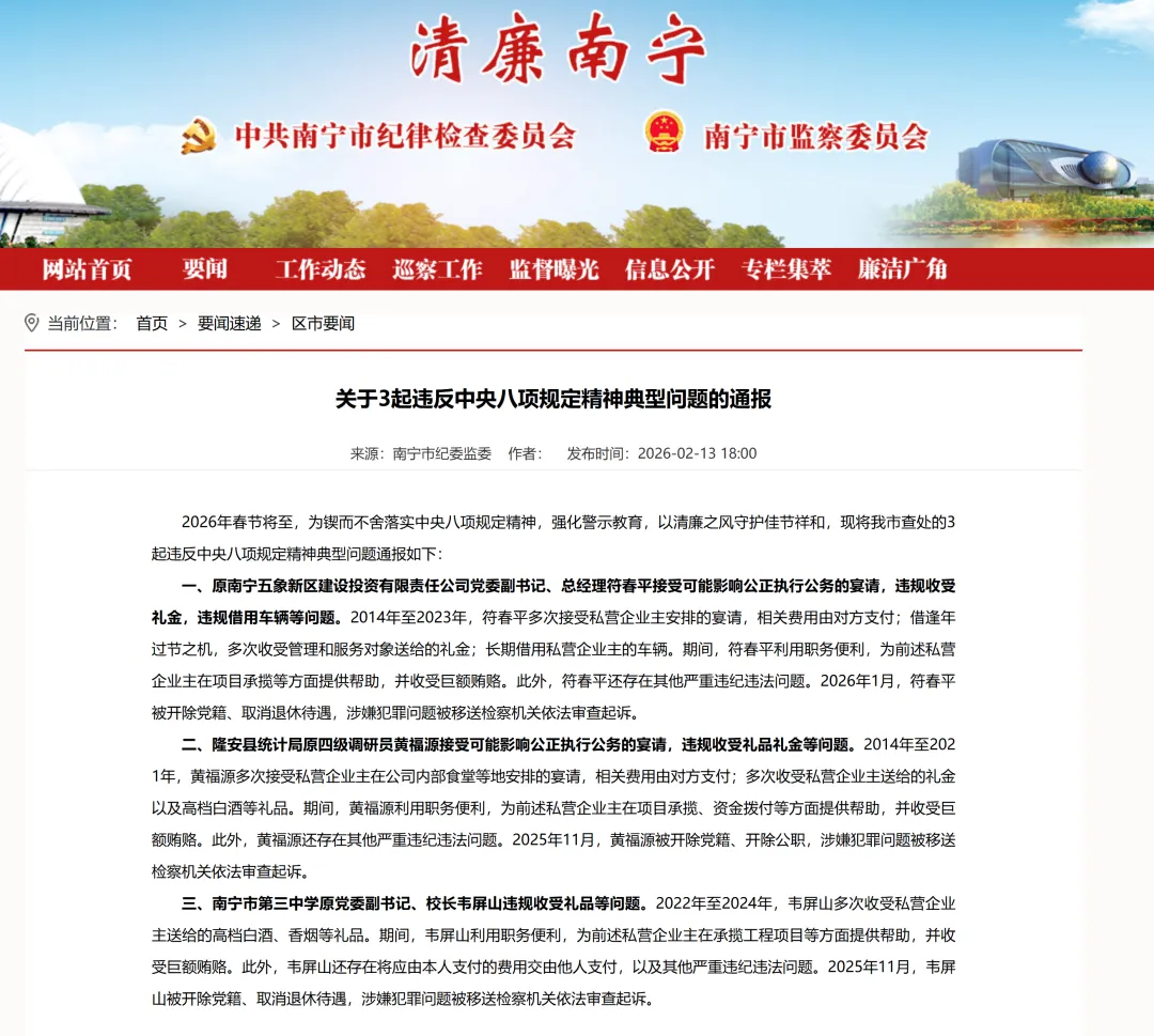 2月13日,南宁纪检监察网发布了关于3起违反中央八项规定精神典型问题的通报。通报原文如下: