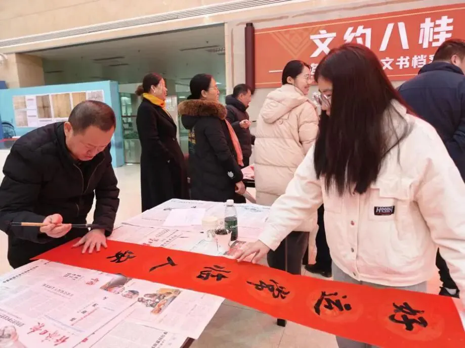 2月10日,“笔墨传情 福满新春”写春联活动在市国家档案馆一楼大厅举行 (周红 摄)