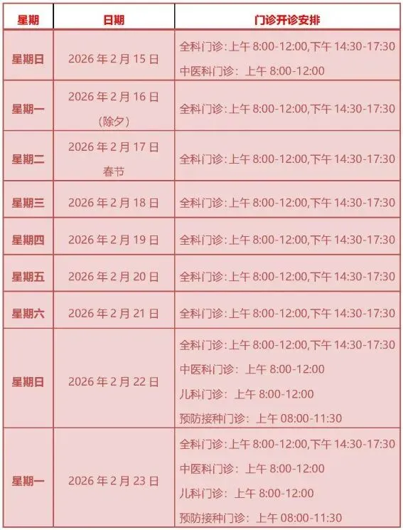 根据国务院2026年春节放假安排,结合我院实际情况,现将春节期间门急诊工作安排如下,愿为您和家人的节日安康增添一份安心与保障。