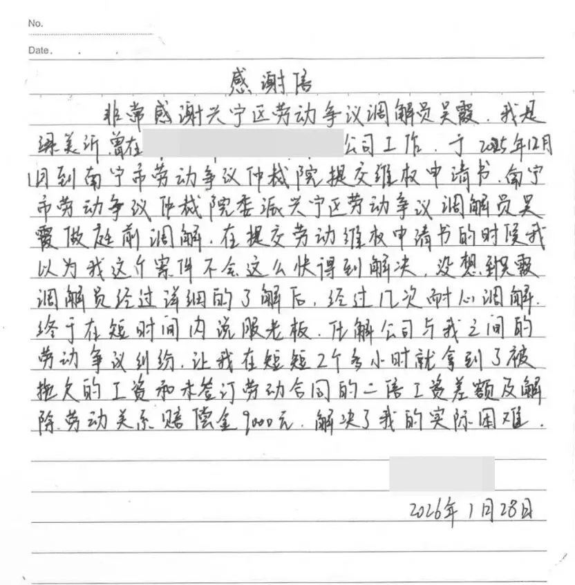 “非常感谢兴宁区劳动争议调解员吴霞!”2月1日,调解中心收到一封手写感谢信,字里行间满是梁女士对调解员吴霞的真挚谢意。