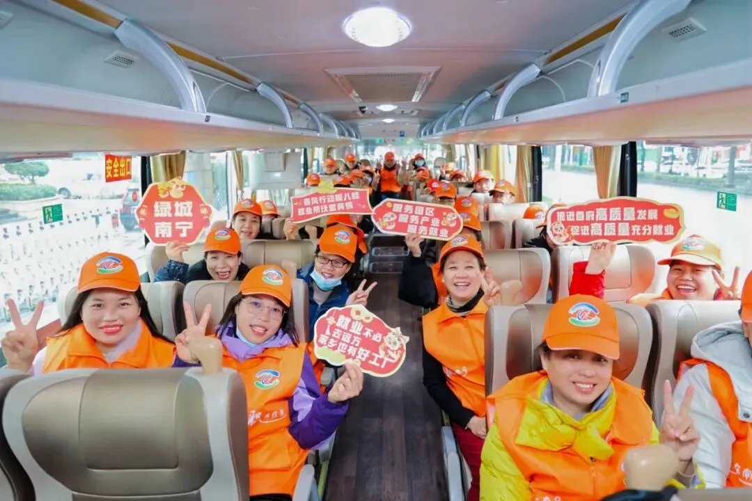 ▲2025年2月7日,2025年广西“就业暖心·桂在行动”专项服务活动暨重点产业园区用工服务专项行动(南宁市片区)专场招聘会上,求职者乘坐专车前往南宁市重点企业