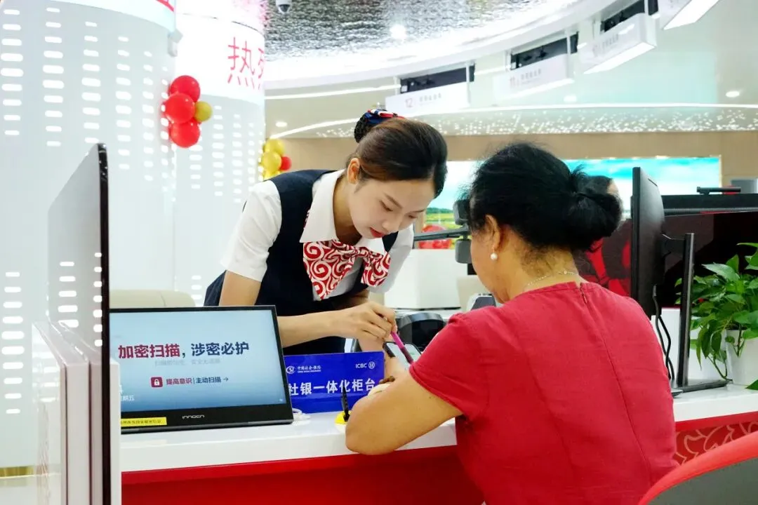 ▲南宁市人社部门创新社保服务模式,打造“15分钟社保便民服务圈”,联合交通银行、工商银行等金融机构,将36项企业群众办理需求高的社保业务事项“搬进”全市57个合作银行网点。图为2025年8月8日,群众在工行网点办理社保业务