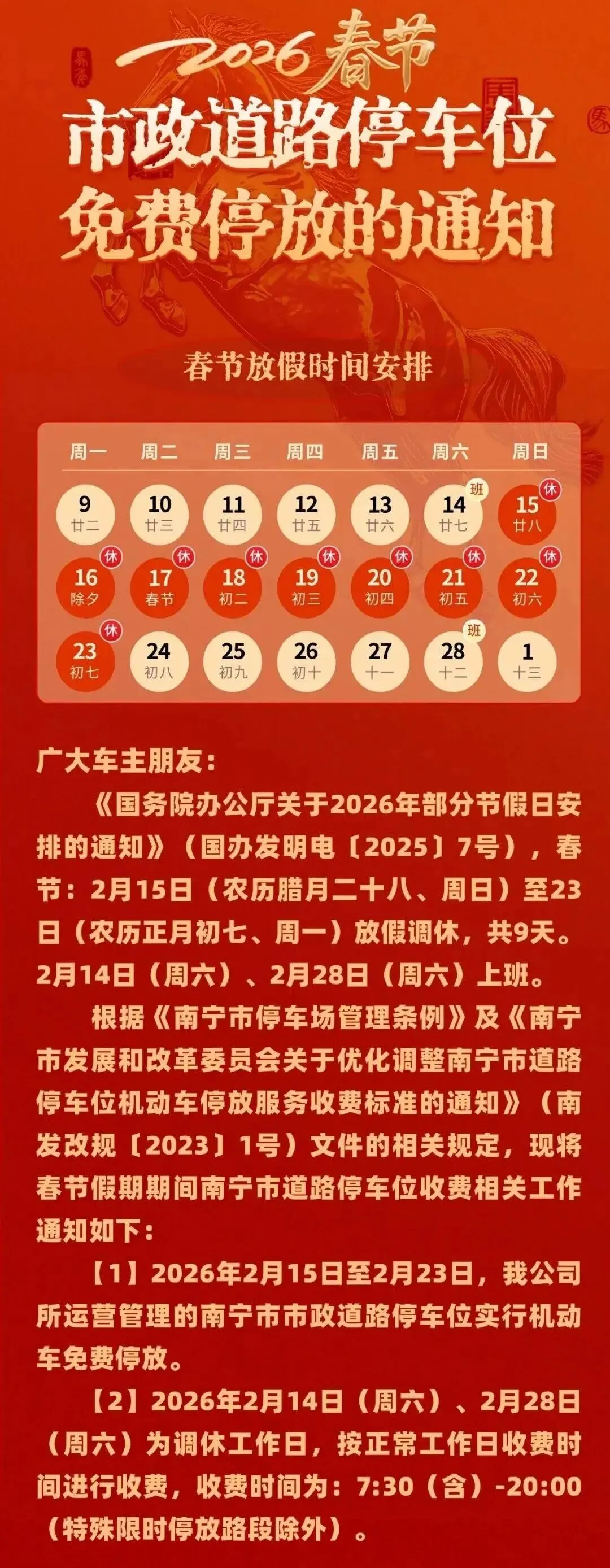 >2026年春节 | 南宁市政道路停车位免费停放的通知,具体内容如下