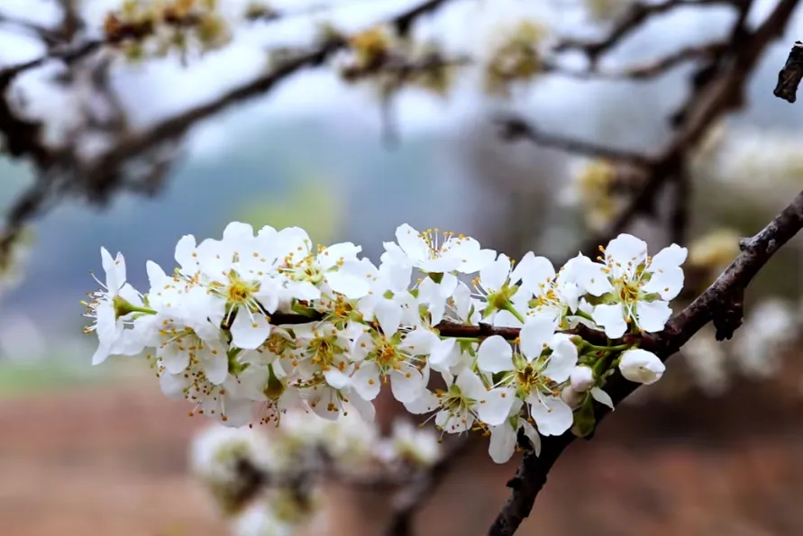 漫山遍野的李树竞相绽放