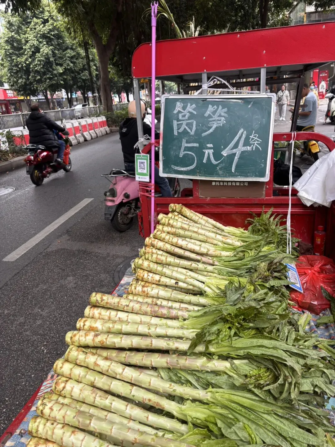 我上午出去洗头发,回家途中在路边看到一位老表在卖菜。他应该是位流动小贩,这类小贩在南宁街上很常见,他们有的是卖水果,有的是卖瓜子花生,有的是像这位老表一样卖菜。他们把货物装在一辆三轮车上,再配上一个电子秤,骑着三轮车走街串巷,方便自己,也方便街坊。老表的青菜看起来很健康新鲜,更重要的是,一把2.5元,这个价格太感人了,我忍不住买了一把豌豆苗。