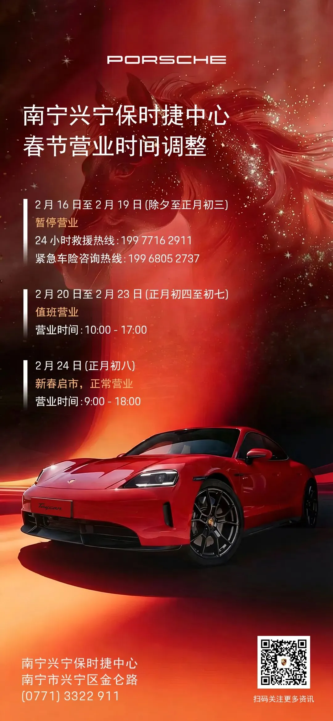 燃擎新岁 | 南宁兴宁保时捷中心春节营业时间调整