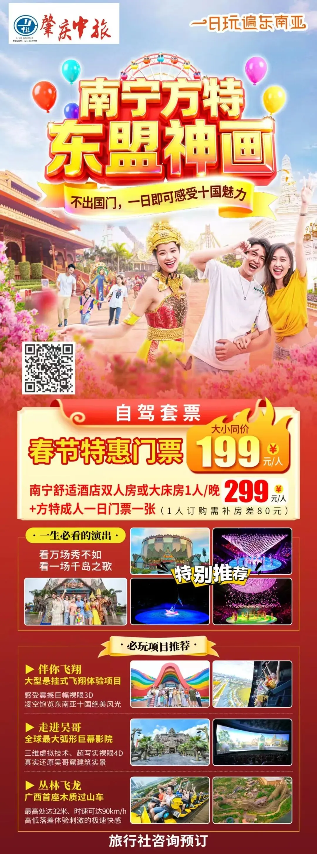 南宁方特东盟神话乐园位于青秀区青环路66号,倚青秀山,沿邕江而建。园区包含了东南亚风情街、五大主题餐厅、十一大室内主题项目及十三余项室外游乐项目。是一个老少皆宜的主题乐园,适合家庭亲子休闲旅游,同时也适合年轻人寻奇探险。这里有长者钟爱的特色演艺,有孩子们喜欢的熊出没主题区,也有年轻人向往的惊险刺激型游乐项目群,一家人各得其所,甜蜜温馨,其乐融融。