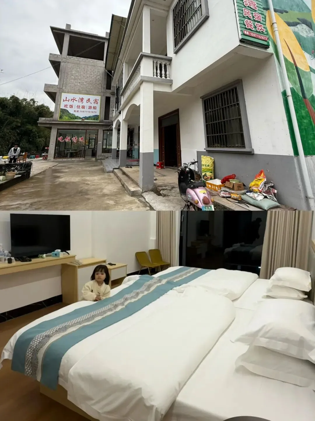 🛖住宿:住的山水湾民宿,跟回老家住似的好乡村小楼房间很大、干净,住的标间应该是唯一一间有落地窗的,两张床推在一起就得到一张超大亲子床,价格很便宜。