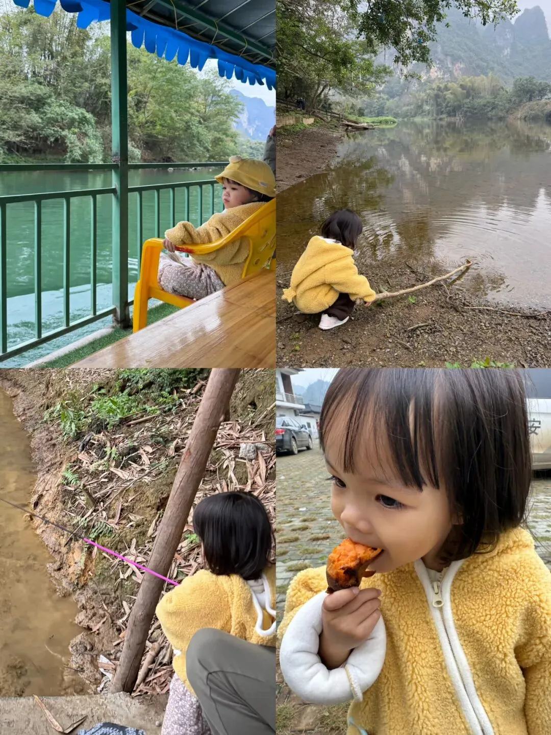 民宿门口就是坐船码头,当天傍晚我们一家三口很幸运坐上了最后一趟民间船,风景很美,第二天一早就来了很多j 看着不给村民开船了,可能春节开放。还可以沿着黑水河一路感受美丽风光,小村庄散步感受风土民情,民宿老板特别好,可以借电动车,但是微雨蒙蒙就没有带娃骑行了。