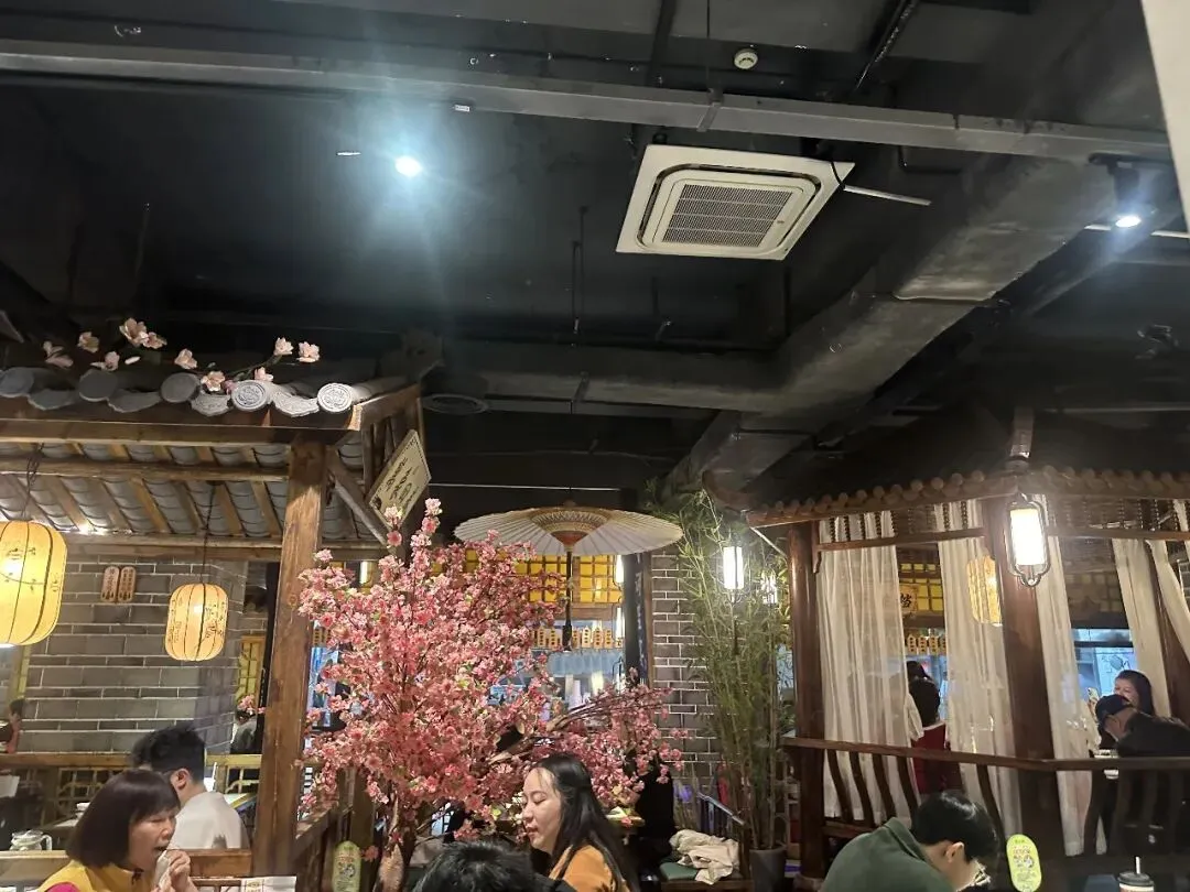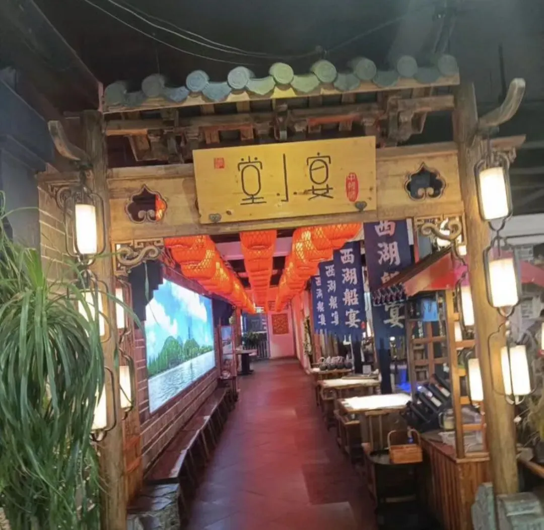 来到百盛西南商都四楼,抬头就看到了“堂小宴”的招牌,古色古香的木牌坊,挂着一排红灯笼,门口还摆着仿真的桃花树,环境看着很吸引人。