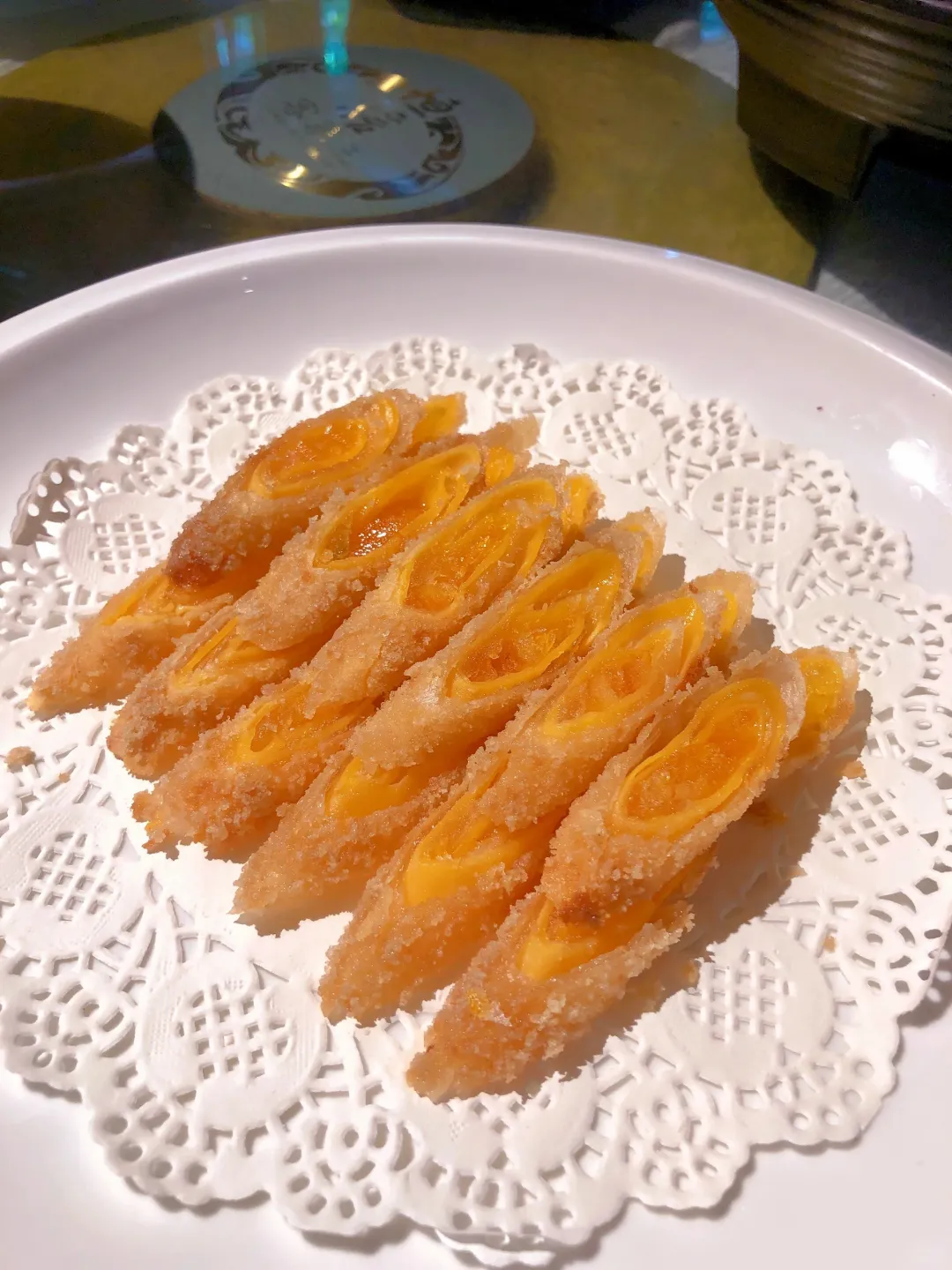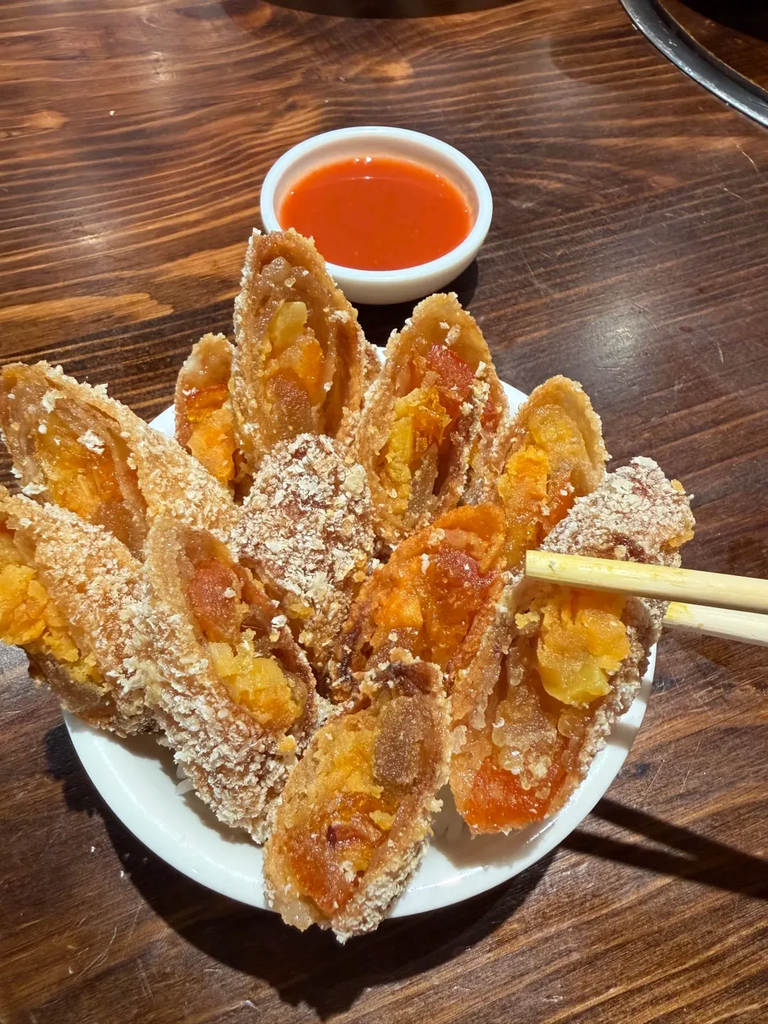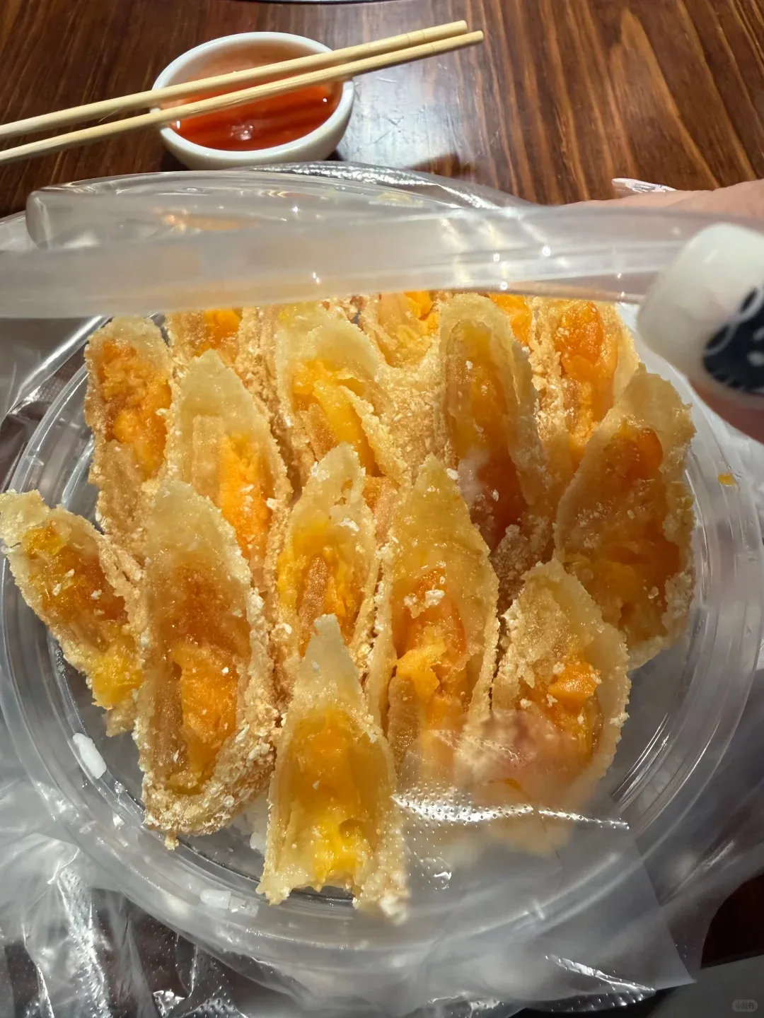 夹起一块,蘸酸甜酱汁,一口咬下去,外酥里嫩。那种油脂的香气混合着内馅的绵密,再加上酱汁解腻,口感层次真的太丰富了,完全停不下来!