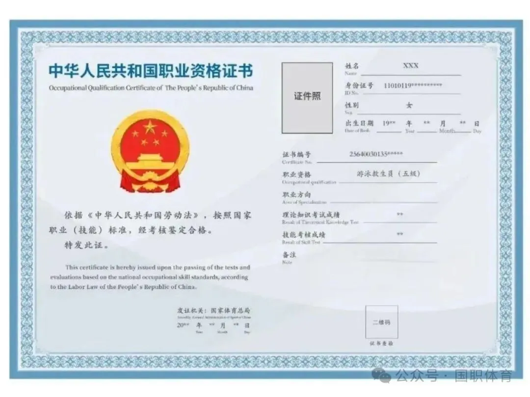 发证单位:中华人民共和国人力资源与社会保障部、国家体育总局职业技能鉴定指导中心