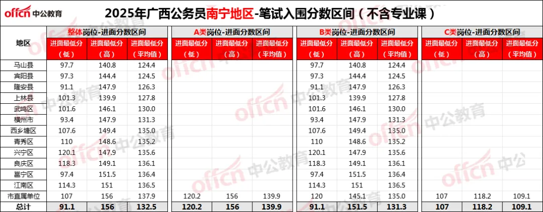 带大家看看2025年广西公务员考试南宁地区的入面分情况,供大家参考!从整体岗位进面分来看,最高值为156分,最低入面分为91.1分,平均分132.5分。