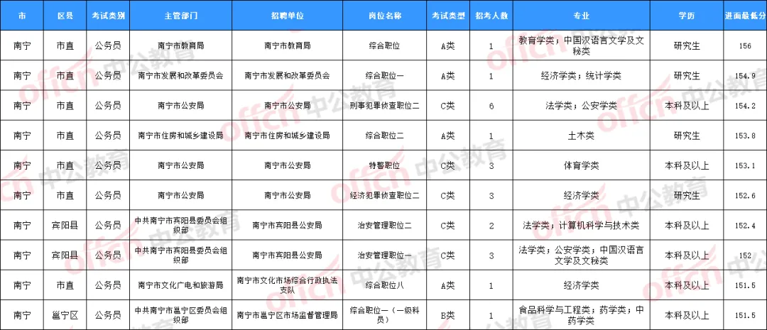 南宁市教育局的综合职位,入面最低分为156分;南宁市发展和改革委员会的综合职位一,入面分最低分为154.9分;南宁市住房和城乡建设局的综合职位二,入面分最低分为153.8分。