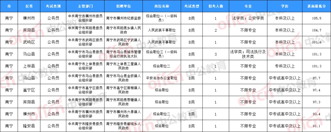 南宁市横州市六景镇人民政府的综合职位二,入面最低分为93.4分南宁市隆安县都结乡人民政府的综合职位,入面分最低分为91.1分