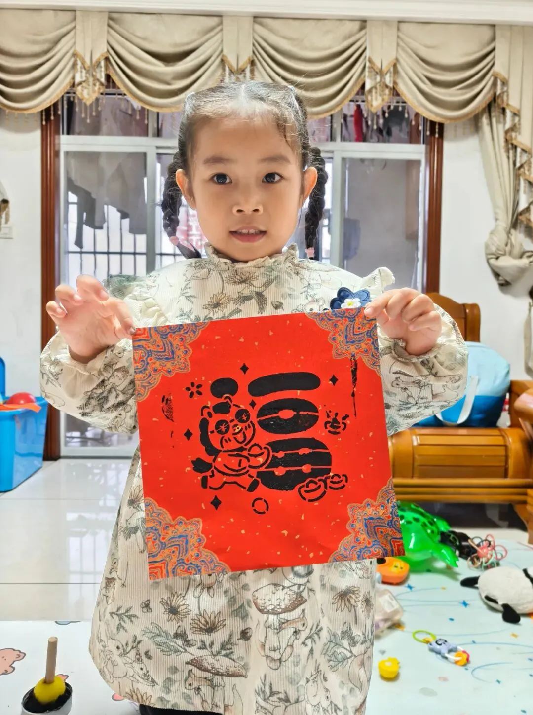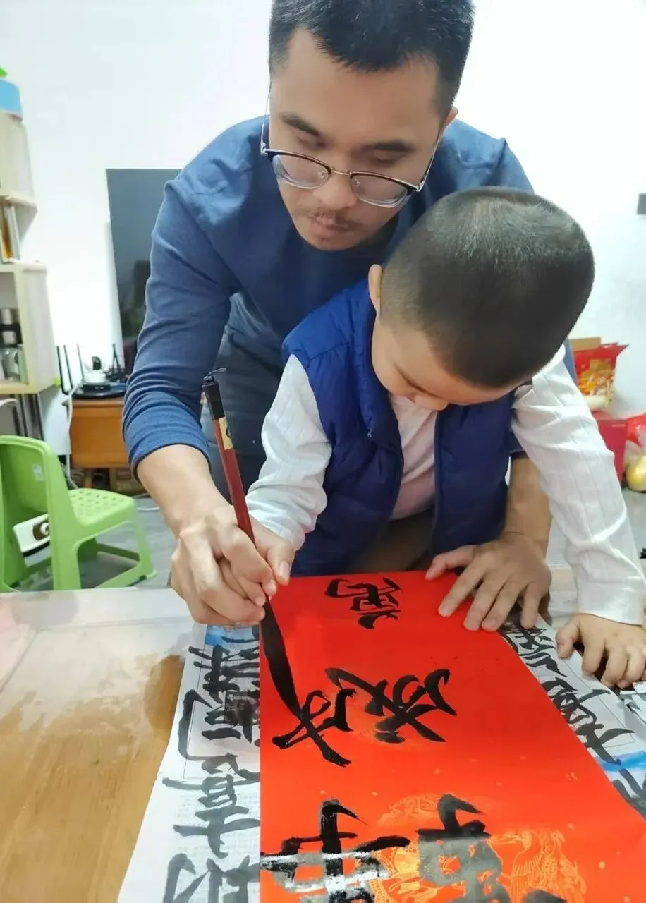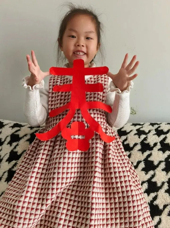 铺纸研墨书写“福”字,张贴春联;还动手剪制各式窗花、制作小灯笼,将传统工艺与童趣设计巧妙结合。
