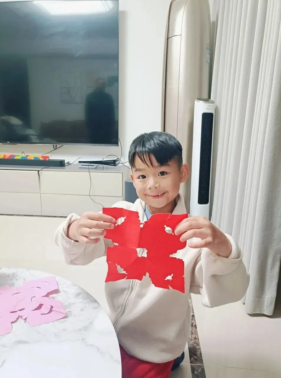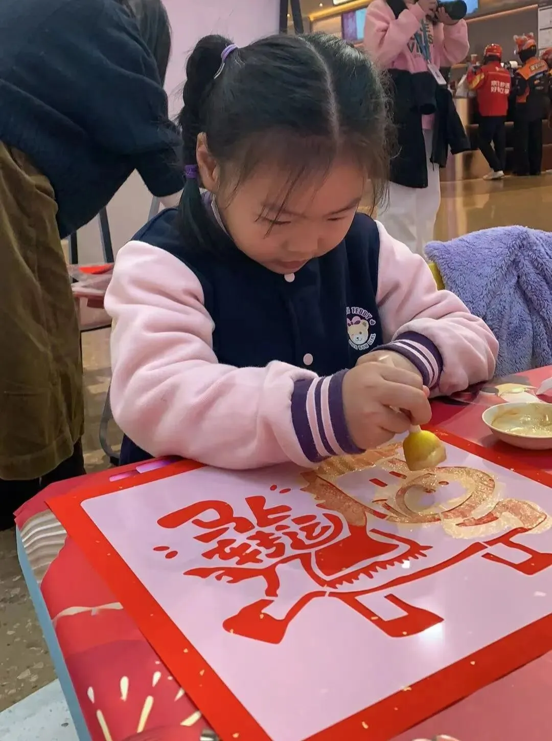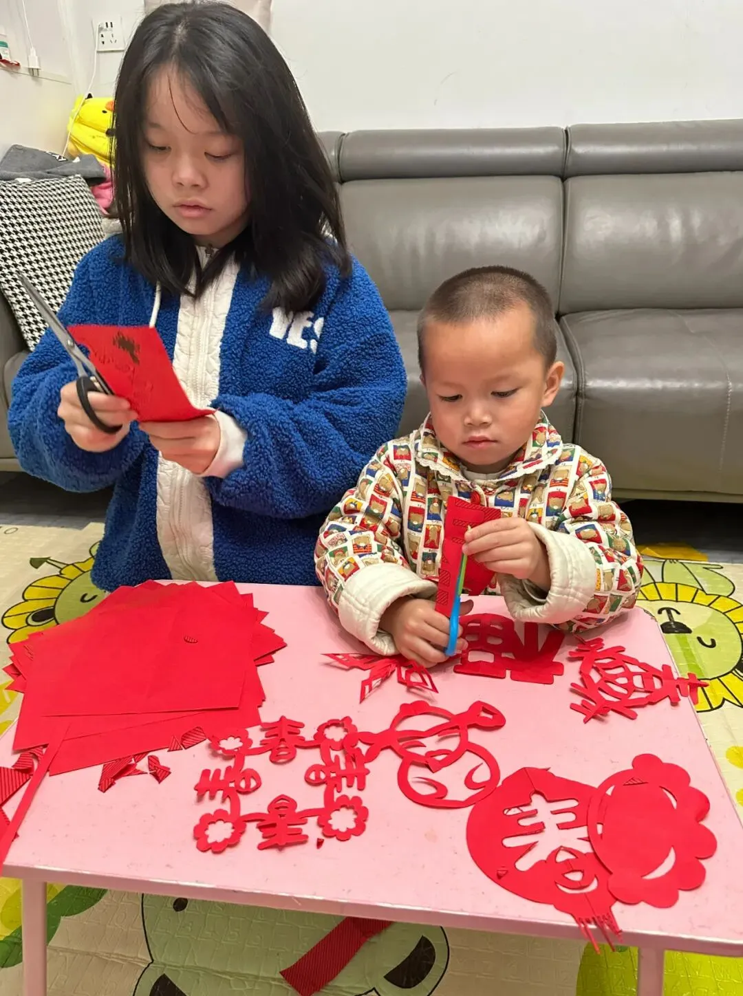 铺纸研墨书写“福”字,张贴春联;还动手剪制各式窗花、制作小灯笼,将传统工艺与童趣设计巧妙结合。