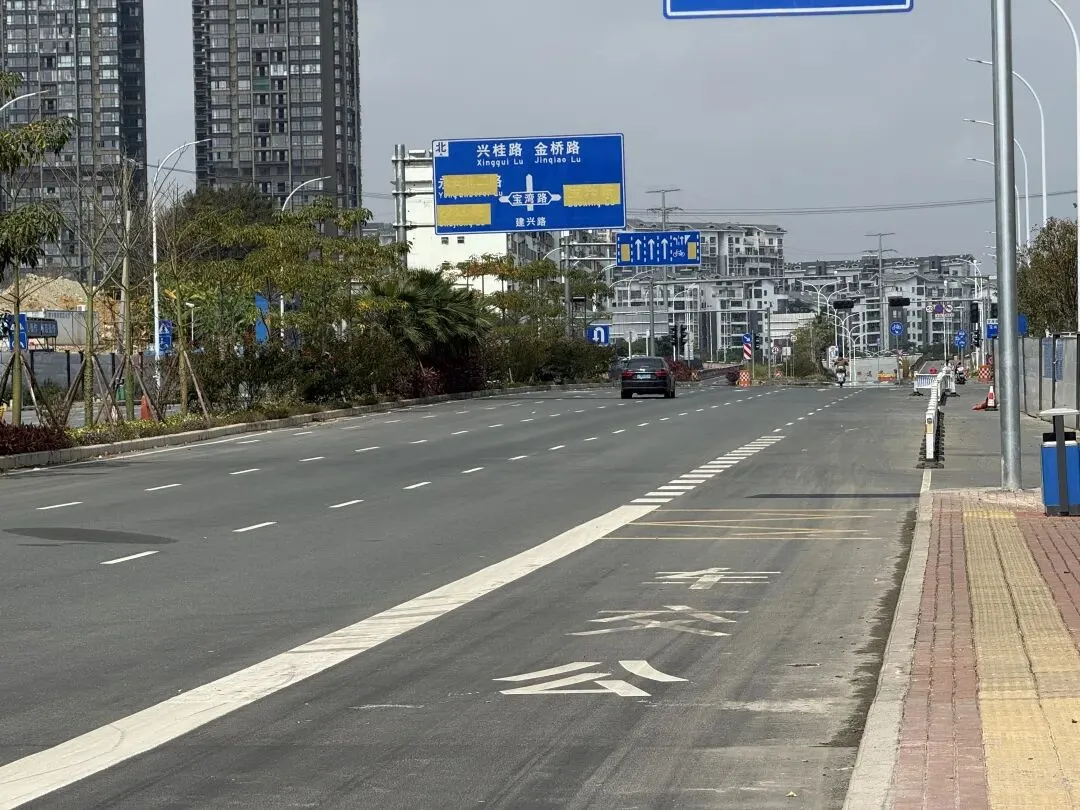 最后,整段建兴路的顺利通车,也实现了从金桥片区兴桂路至东沟岭片区南梧大道全长约1000米的顺畅连通,有效缓解快环及兴宁东片区交通压力。