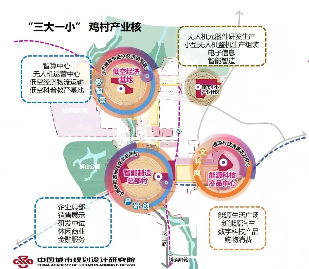 “三大一小”即鸡村的四大功能,分别是:智能制造总部村、大鸡村低空经济基地、数字科技创新中心、都市工业产业社区。