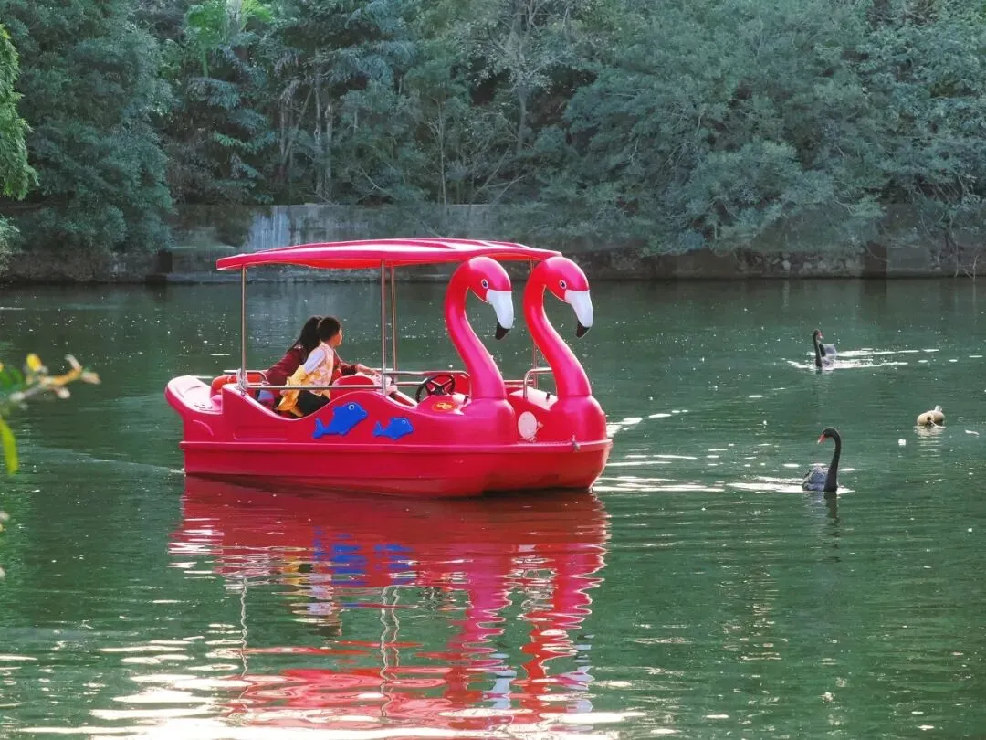在天鹅湖旁可以饲喂天鹅锦鲤,还能乘坐游船,看鹈鹕抓鱼、黑白天鹅戏水,在阳光下感受清风拂面。