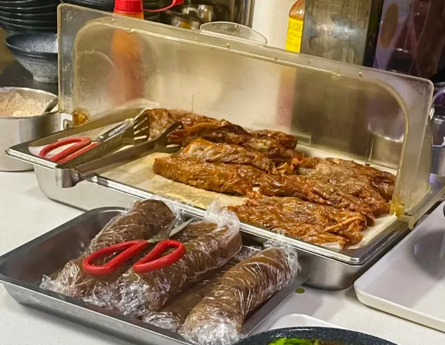 吃起来的感觉和春卷确实很不一样。因为猪肉是切丁的,嚼起来比肉糜更有劲道,能明显感受到肉的质感。